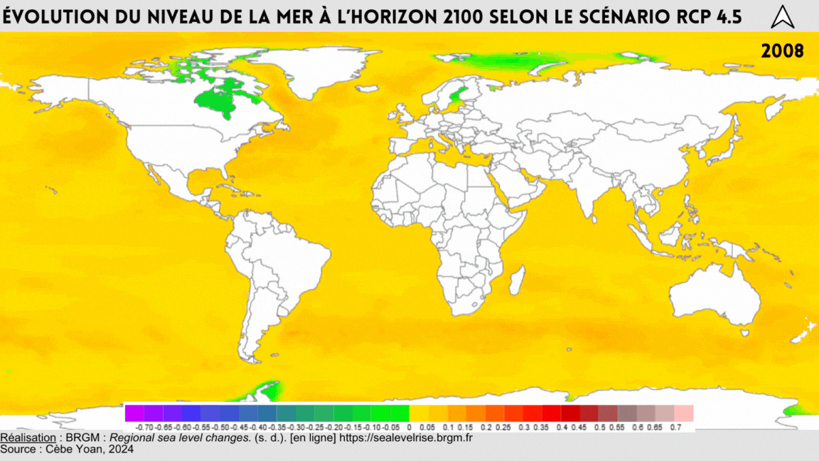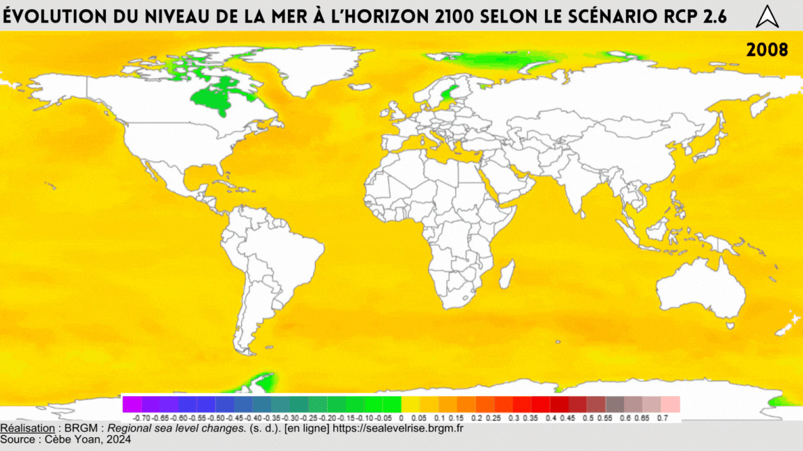 Les illustrations ci-dessous (cf figures 11 et 12) permettent d’observer ces disparités d’élévation du niveau de la mer de 2008 à 2100, en fonction de deux scénarios du GIEC, les scénarios RCP 2.6 et RCP 4.5.